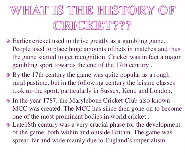 Cricket wordt wel een beetje gezien als rijkeluissport, in de 18e eeuw was het de belangrijkste sport van de Britse Aristocratie. De Londense elite stoorde zich aan het feit dat iedereen de wedstrijden konden zien. De wedstrijden waren alleen bestemd voor de aristocraten in Londen. Daarom werd er door Thomas Lord in 1787 in de wijk Marylebone een afgesloten cricketterrein gemaakt. Daar werd een jaar later door de Marylebone Cricket Club (MCC) de eerste cricketwedstrijd georganiseerd. Door deze vereniging werden ook de eerste cricketwetten geïntroduceerd, die nu nog steeds gelden. In 1811 verhuisde het stadion naar Regent’s Park en drie jaar later weer naar St John’s Wood. Op deze plek zit The Home of Cricket zoals het ook wordt genoemd nog steeds. Daar deed in 1824 ook de eerste grasmaaier zijn intrede, daarvoor deed een kudde schapen het maai werk.